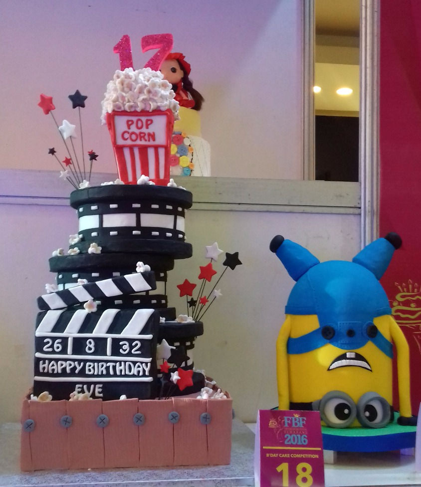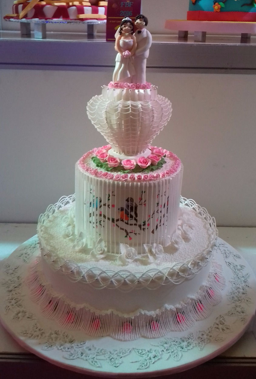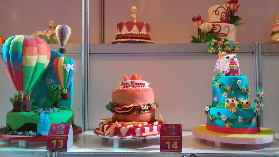 モールで行われていたケーキのコンペ。誕生日ケーキからウェディングケーキまで、カラフルなケーキが並びます。